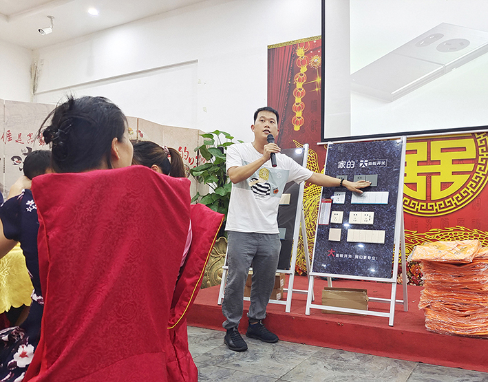 首先,由家的惠州、河源、梅州區(qū)域經(jīng)理——黃堯濤發(fā)表講話。他為大家詳細地介紹家的新品——第3代復位大板開關(guān)、一體式防水插座。