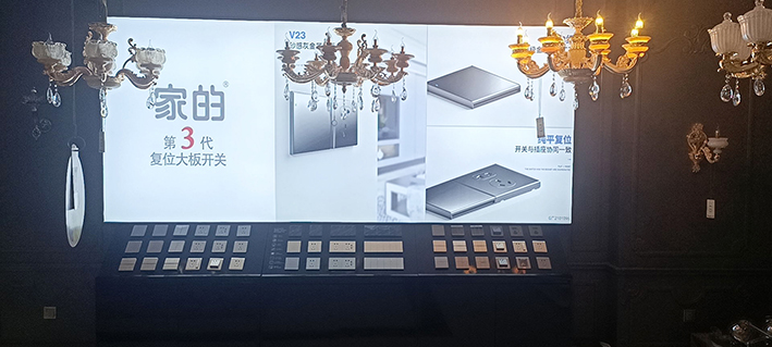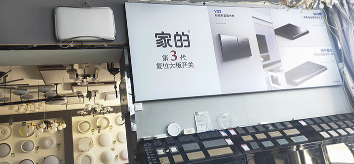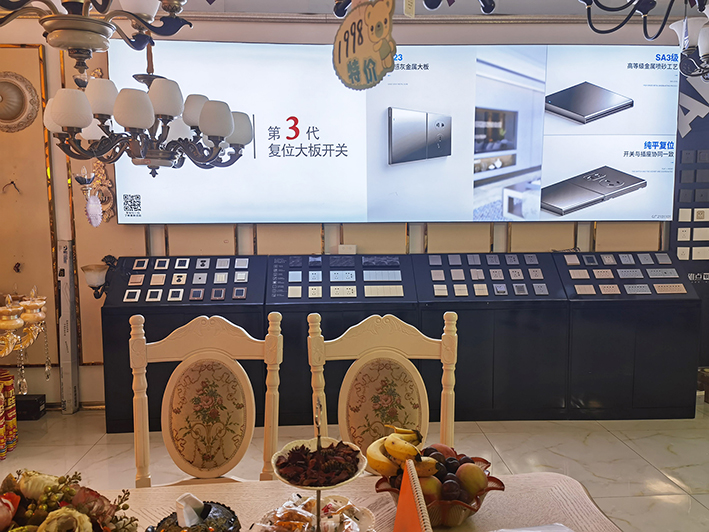 家的實體店軟膜燈箱展示屏,設計風格大氣、美觀,在燈光的照耀下,格外地醒目。它充分地展示第3代復位大板開關的魅力,吸引行人駐足觀看。進到實體店里的消費者,咨詢有關第3代復位大板開關的信息,并仔細端詳,體驗手感。