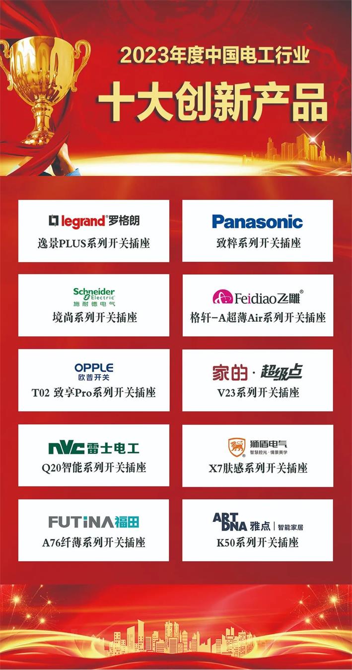 家的3大榮譽分別是:2023年度中國電工行業(yè)“十大領(lǐng)軍品牌”、“消費者信賴品牌”、“十大創(chuàng)新產(chǎn)品”。